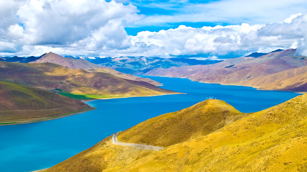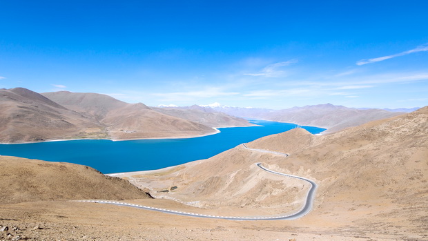 Con đường uốn khúc mềm mại tựa như chiếc khăn bao quanh hồ Yamdrok